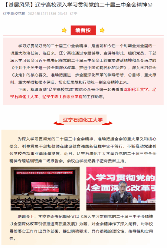 编者按:学习好贯彻好党的二十届三中全会精神,是当前和今后一个时期全党全国的一项重大政治任务。连日来,辽宁高校通过专题辅导、宣讲等形式,组织党员、干部深入学习领会习近平总书记在党的二十届三中全会上的重要讲话精神和全会通过的《中共中央关于进一步全面深化改革、推进中国式现代化的决定》,深入学习领会《决定》的核心要义。12月18日,辽宁高校党建微信公众号对我校举办党的二十届三中全会精神专题培训班第二场报告会进行了组稿宣传报道。现将相关报道转载如下: