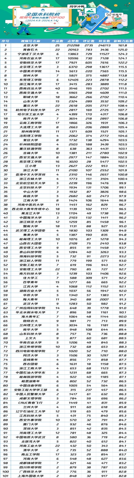 编者按:“全国高校视频号影响力指数”由中国青年报中青校媒发布,中青华云数据支持。2024年4月17日,中青校媒微信公众号发布全国高校(本科院校/职业院校)视频号影响力指数(2024.4.8-2024.4.14),我校成功上榜。现将相关报道转载如下: