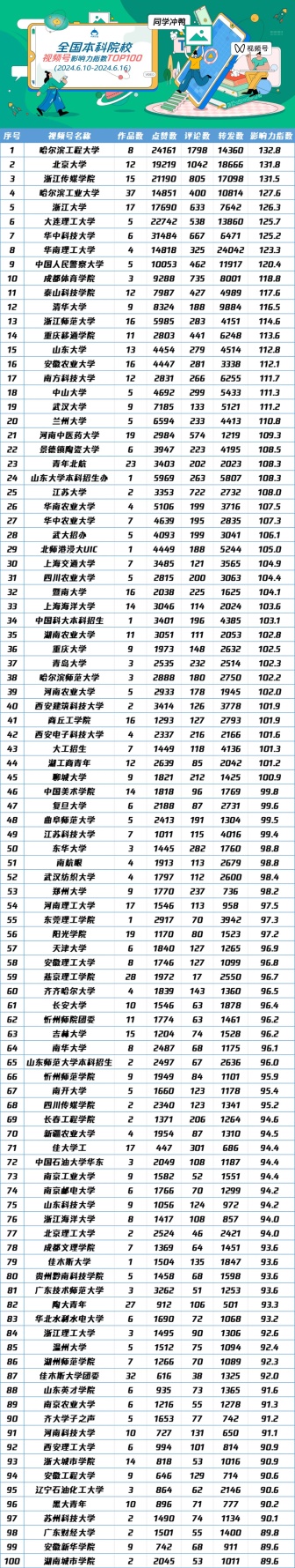 编者按:“全国高校视频号影响力指数”由中国青年报中青校媒发布,中青华云数据支持。2024年6月20日,中青校媒微信公众号发布全国高校(本科院校/职业院校)视频号影响力指数(2024.6.10-2024.6.16),我校成功上榜。现将相关报道转载如下: