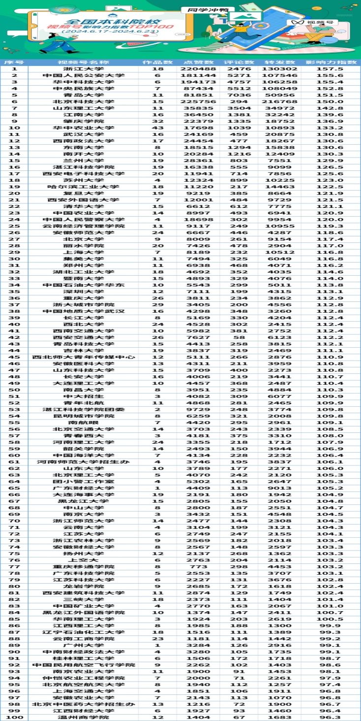 编者按:“全国高校视频号影响力指数”由中国青年报中青校媒发布,中青华云数据支持。2024年6月25日,中青校媒微信公众号发布全国高校(本科院校/职业院校)视频号影响力指数(2024.6.17-2024.6.23),我校成功上榜。现将相关报道转载如下: