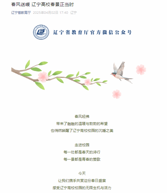 编者按:春风轻拂,带来了融融的温暖与勃勃的希望,也悄然唤醒了辽宁高校校园的沉睡之美,走进校园,每一处都是春天的诗行,每一景都是青春的赞歌,4月2日,辽宁省教育厅官方微信公众号以《春风送暖 辽宁高校春景正当时》发文,共赏这份春日盛宴, 感受辽宁高校校园的无限生机与活力,其中收录了我校宣传部投稿的春景图。现将相关报道转载如下: