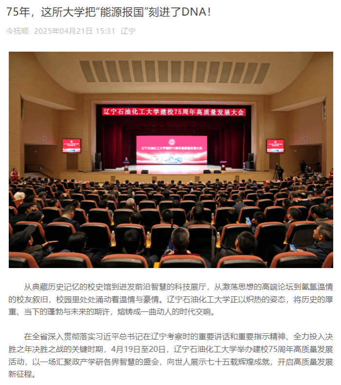 编者按:4月19日至20日,学校举办建校75周年高质量发展活动,以一场汇聚政产学研各界智慧的盛会,向世人展示七十五载辉煌成就,开启高质量发展新征程。今抚顺微信公众号以《75年,这所大学把“能源报国”刻进了DNA!》为题,对此进行了宣传报道。现将相关报道转载如下: