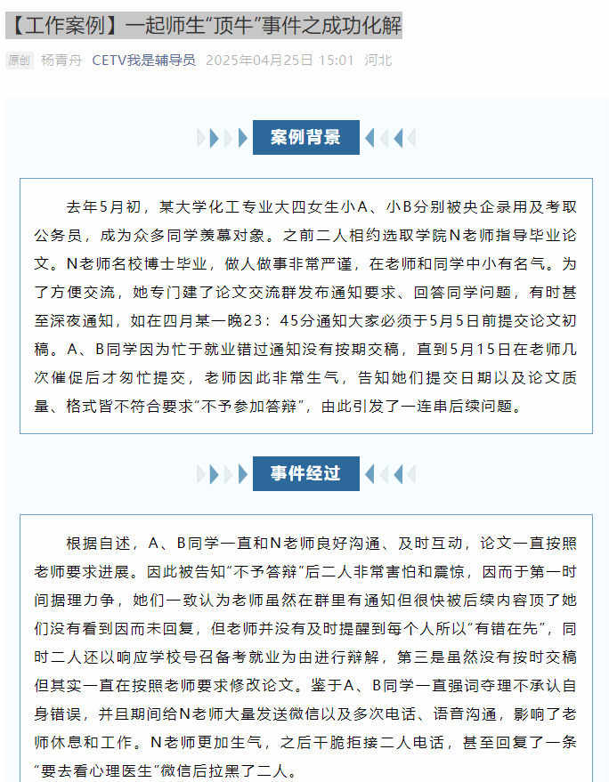 编者按:4月25日,CETV我是辅导员微信公众号刊发我校杨青舟老师撰写的文章《一起师生“顶牛”事件之成功化解》。现将相关报道转载如下: