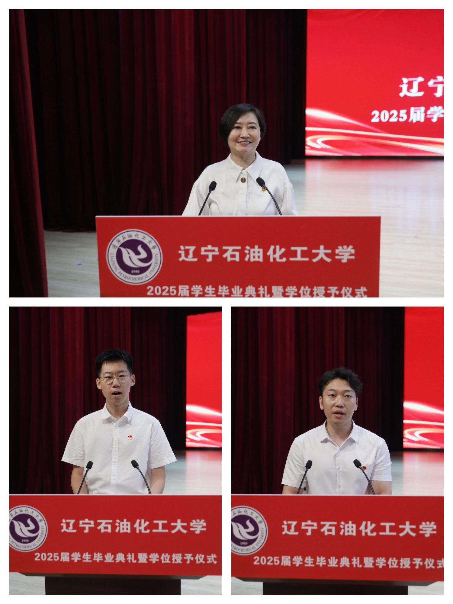 教师代表、第五届全国高校教师教学创新大赛辽宁赛区一等奖获得者史春薇教授发言,她用真挚的话语为毕业生送上美好祝福,字里行间满是对学生的不舍与牵挂;毕业生代表、国际教育学院电外2101班刘子健,马克思主义学院研2211班张永衡分别发言,他们深情表达对母校和老师的感恩之情,并郑重承诺将在新的人生舞台上踔厉奋发,续写“辽石化大人”的华章,展现新时代青年的责任与担当。